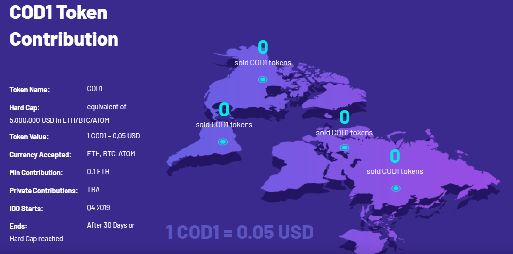 Намерение Co-DEX состоит в том, чтобы обеспечить широкую базу членов сообщества для участия в IDO, запланированном на нашем Dex. Co-DEX не может гарантировать, что все потенциальные заинтересованные стороны смогут получить желаемое распределение во время фаз Private и IDO, а общий максимальный предел будет эквивалентен примерно 5 миллионам долларов США в ETH / BTC / ATOM. Количество токенов, доступных во время вклада токенов, составит 100 000 000 COD1.